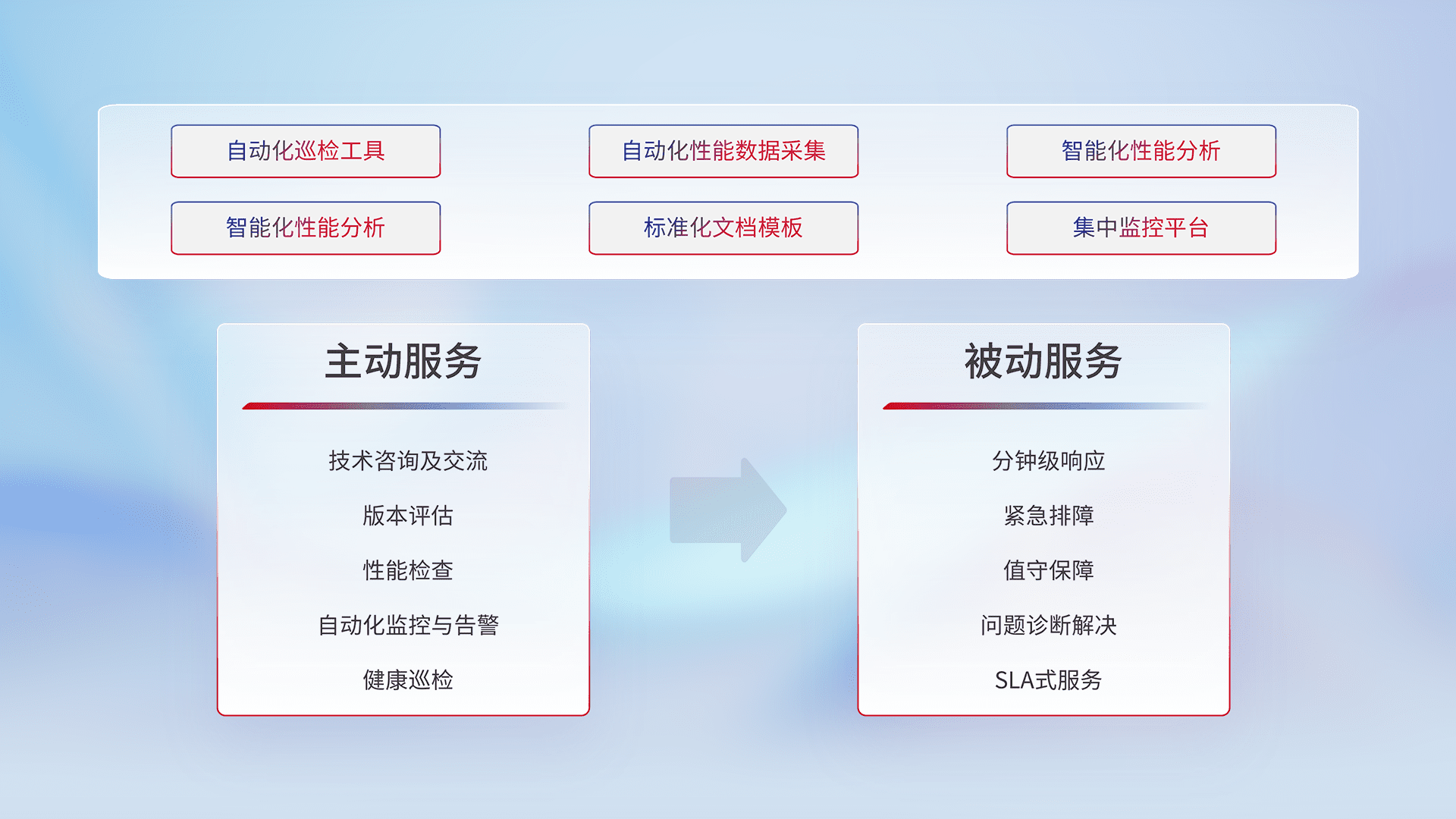 智能化工具和标准化文档,,,,保障服务质量,,,,提供主动服务(包含技术咨询、、、版本评估、、性能检查、、自动化监控与告警、、、、健康巡检)和被动服务包含(分钟级响应、、、紧急排障、、、、值守保障、、、、问题诊断解决、、、、SLA服务)。。。。